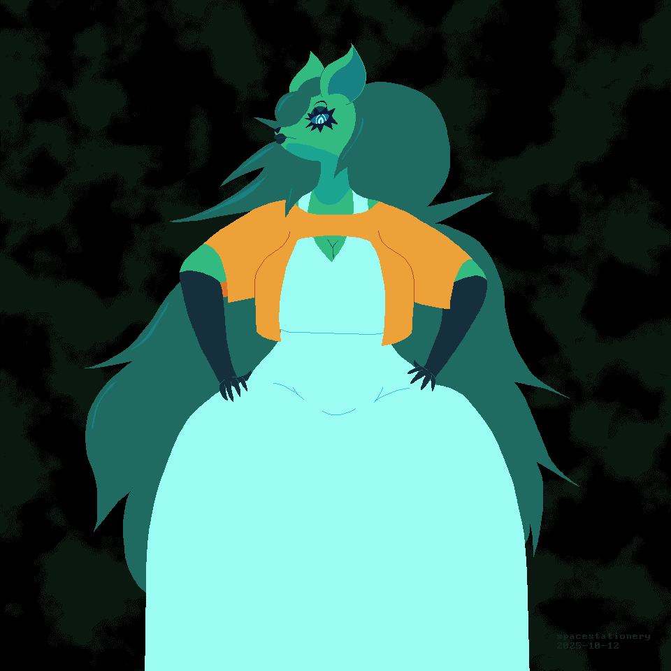 A digital drawing of the anthropomorphic pine tree character Yona. He has green skin with black forearms and long, spiky green hair. His eyes have white pupils and blue sclera. He is wearing a long white dress with a sort of small poncho thing in orange on top. His hands are on his hips and his head is tilted upwards, looking down at the viewer.