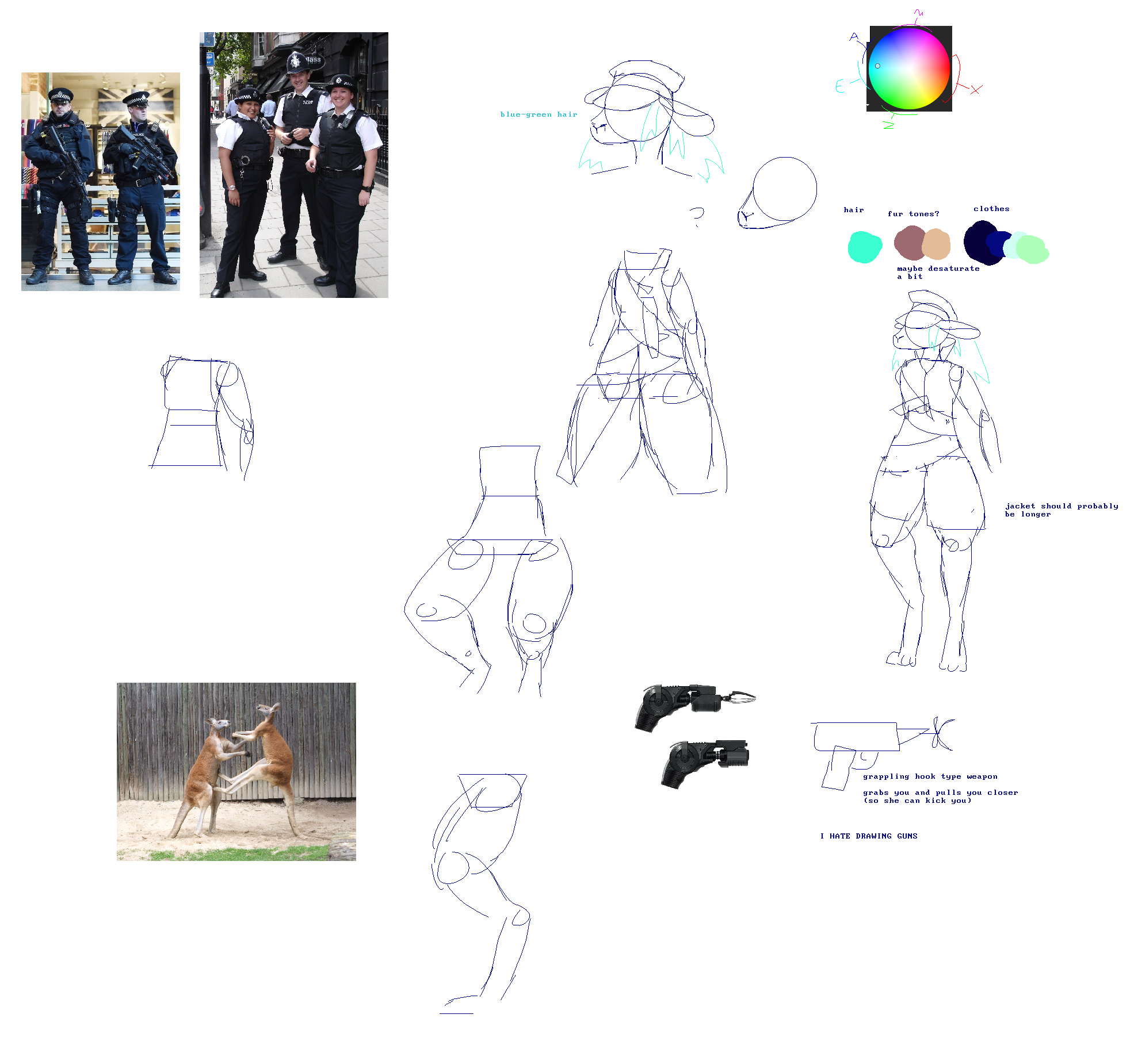 Various crude sketches of a kangaroo-type character. Reference images of police officers and kangaroos are pasted into the upper left and bottom left respectively. To the right are sketches of Elaine's outfit, and to the left are some basic sketches of her body shape. In the lower right is a sketch of some kind of grappling hook gun alongside a couple reference images of such and some text notes: "grappling hook type weapon" and "grabs you and pulls you closer (so she can kick you)". Below that is some text stating "I hate drawing guns" in uppercase. In the upper left is a colour wheel; the cyan-green part is labelled "E", the blue part is labelled "A", the purple-pink part is labelled "M", the red part is labelled "X", and the green part is labelled "Z". Don't worry about what any of that means