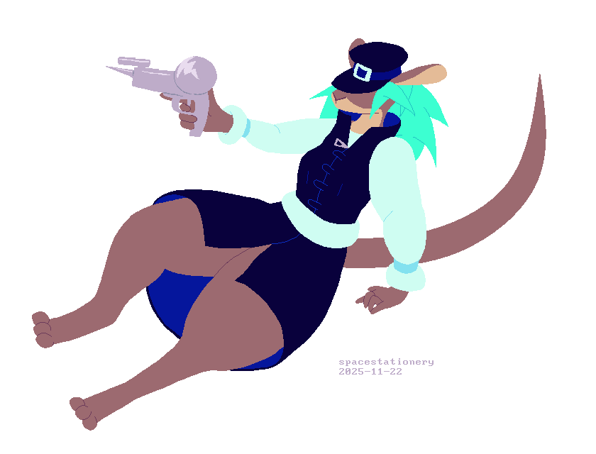 A digital drawing of the anthropomorphic kangaroo character Elaine. She has brown fur with tan fur on her inner ears and the underside of her face, going down to her neck and torso. She has bright blueish-green hair, which flows out from underneath a dark blue cap with a light blue buckle reminiscent of a police officer's hat and a cap that covers her eyes. She is wearing a dark blue jacket with puffy light blue sleeves and a belt in the same light blue colour. The jacket extends halfway down her thighs, which are bare. She is in a "vault" pose, as if she is leaping over a barrier, with her left arm propping her up and her right arm holding a grey Gun-Like Object.